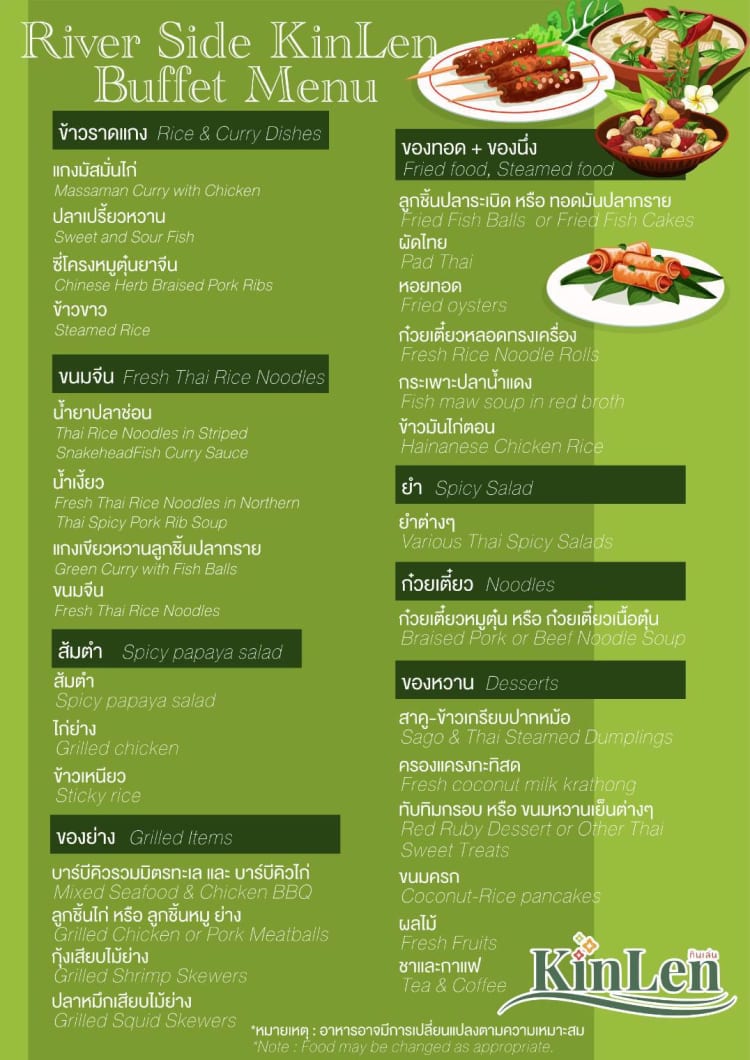 Riverside Kin Len - Street Food Cruise brings you delicious buffet dinner of Thai street food, sweet treats, unlimited chrysanthemum tea, and a lively 90’s musical show on a smooth twin-hull boat with stunning 360° river views.